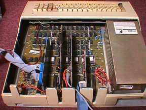 And an interior view. This shows the disk controller card on the left, followed by the Z-80B CPU coprocessor card for CP/M, the 80 column card, and the parallel printer card.